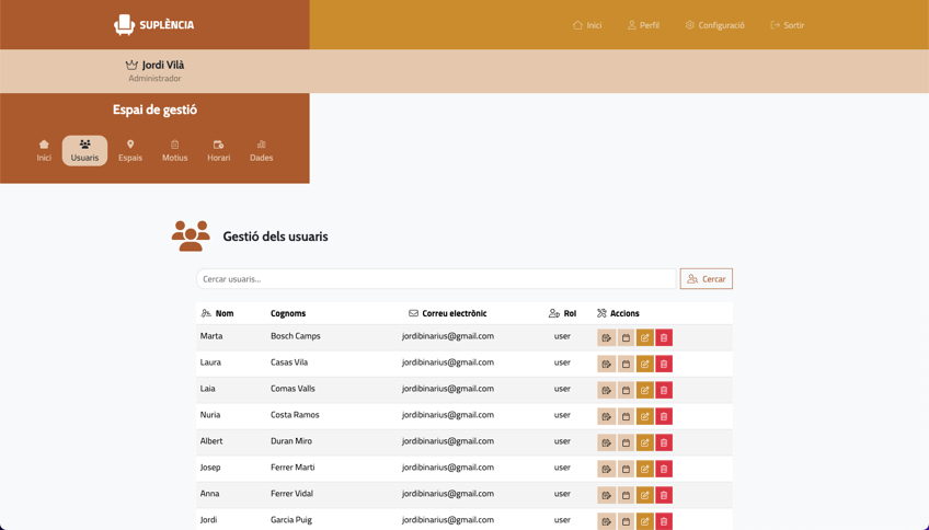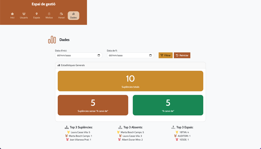 Completíssima interfície d'administració: des de la gestió integral de les suplències, passant perl control absolut dels usuaris, els espais, els motius i l'horari.